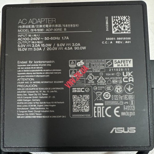 Блок питания для ноутбука Asus VivoBook K, M, S 14, 14X, 15, 16X; ZenBook A14, 14X, UX; ExpertBook B5, а также других моделей ноутов. Более полный, но не исчерпывающий перечень совместимых моделей указан ниже на это странице. Зарядное устройство поддерживает несколько режимов работы. Основной режим выдаёт 20V (вольт) и 4.5A (ампер) с максимальной мощностью 90W (ватт), дополнительные режимы - 15V 3A/9V 3A/5V 3A.